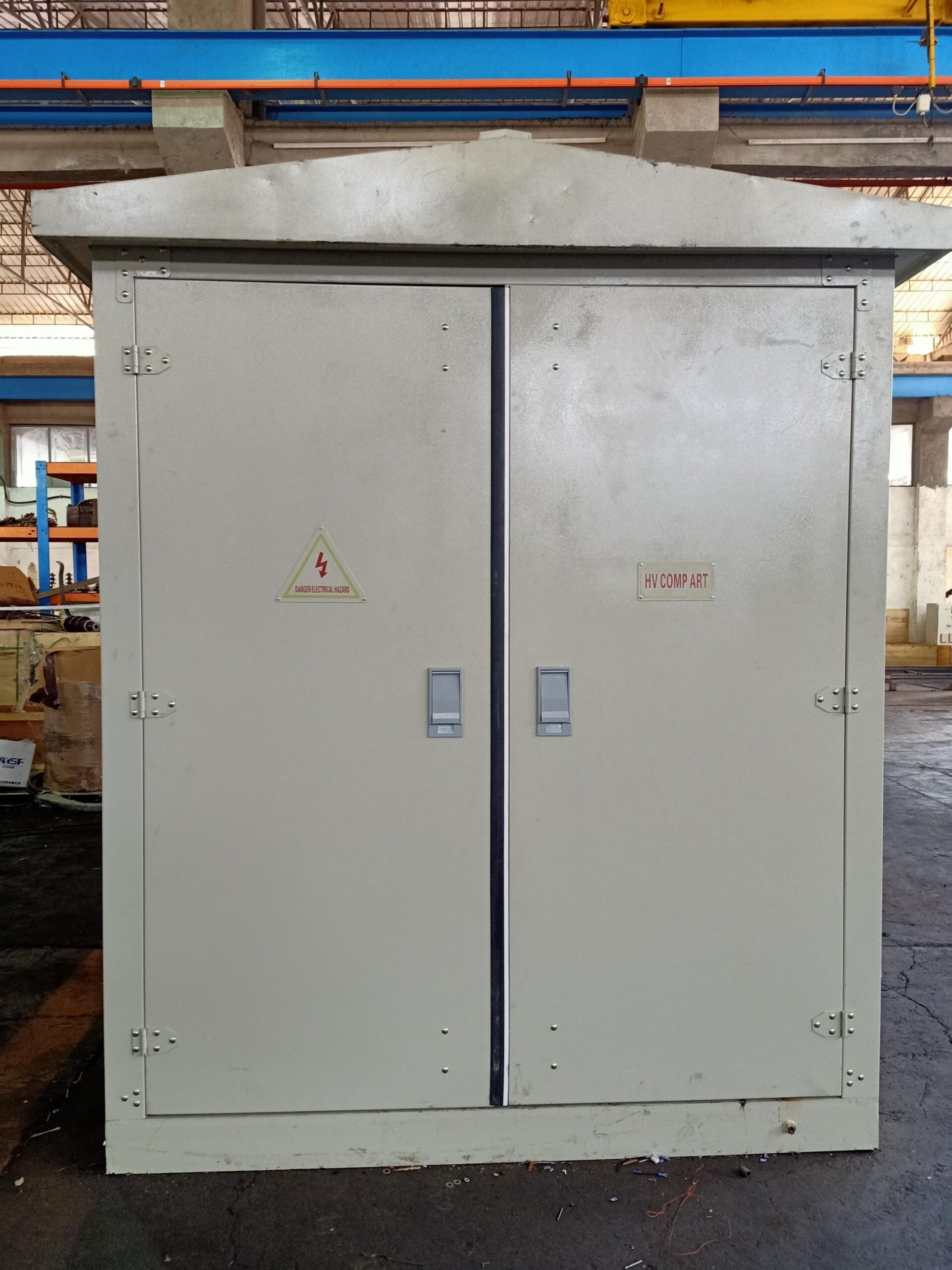 Enclosure outdoor body is made of Galvanised sheet steel in corrugated type design for proper heat dissipation.The enclosure is painted with epoxy based powder paint (colour-RAL 7032) suitable for outdoor installations.The compartments are provided with separate doors and pad locking arrangements.Each compartment is fitted with door operated lamp for illumination purpose.For safety purpose,the transformer compartment doors are fitted with arc reflectors.